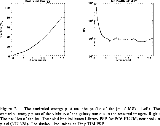 The encircled energy plot and the profile of the jet of M87 are illustrated in Fig. 7. The left panel shows the encircled energy plots in the vicinity of the galaxy nucleus in the restored images, and the profiles of the jet in the restorations are given in the right frame. The solid line in Fig. 7 shows the Library PSF for PC6, F547M, centered on pixel (337,328), and the dashed line shows the Tiny TIM PSF. The differences between the two encircled energy curves are minor. The structure of the faint jet is consistent in both M87 restorations.