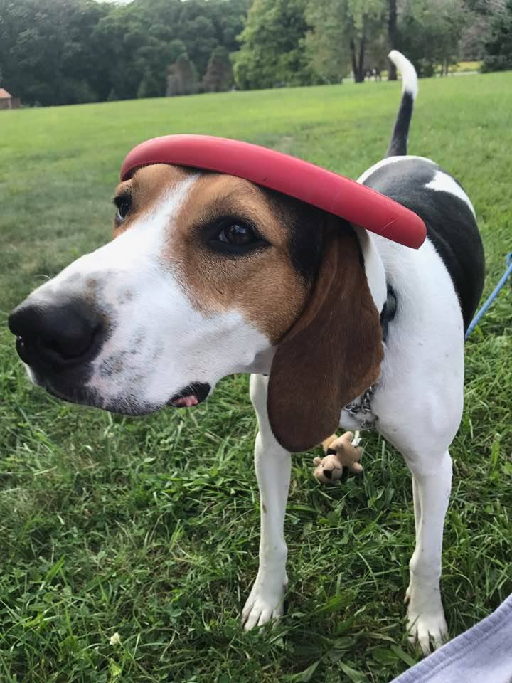 Pup not quite sold on his dog frisbee helmet