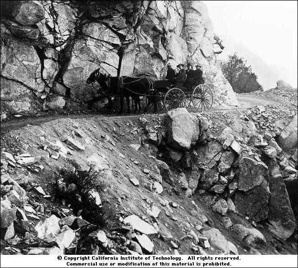 The Mt. Wilson shuttle in the early 1900s (Caltech archives): the un-named driver is on the far left; the passengers are Hale, George Ritchey, the main architect of the 60-inch and 100-inch telescopes, and John D. Hooker, the funding source for the 100-inch Hooker reflector.