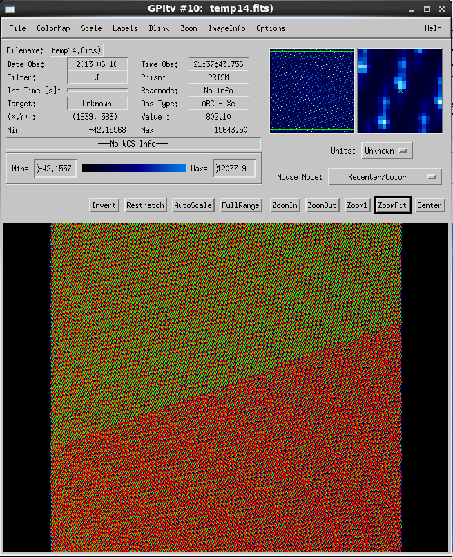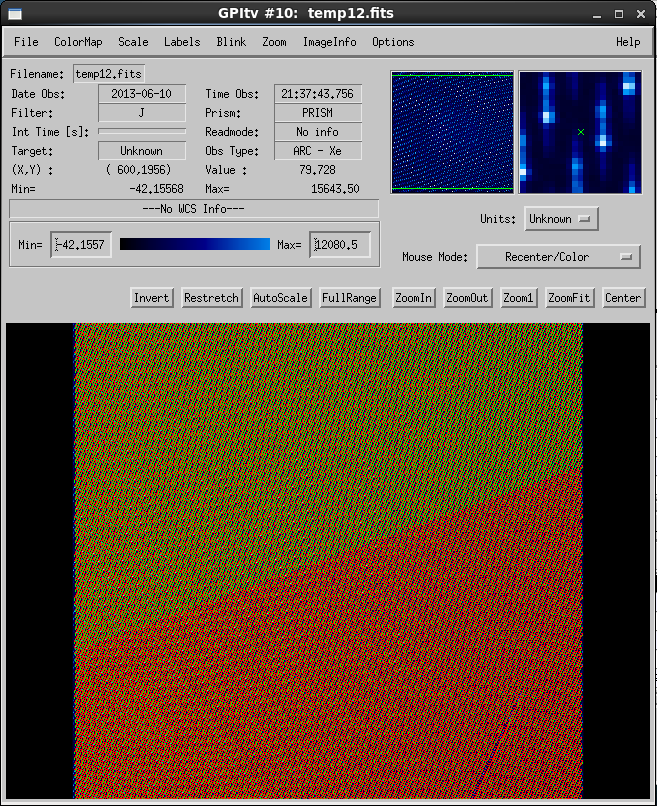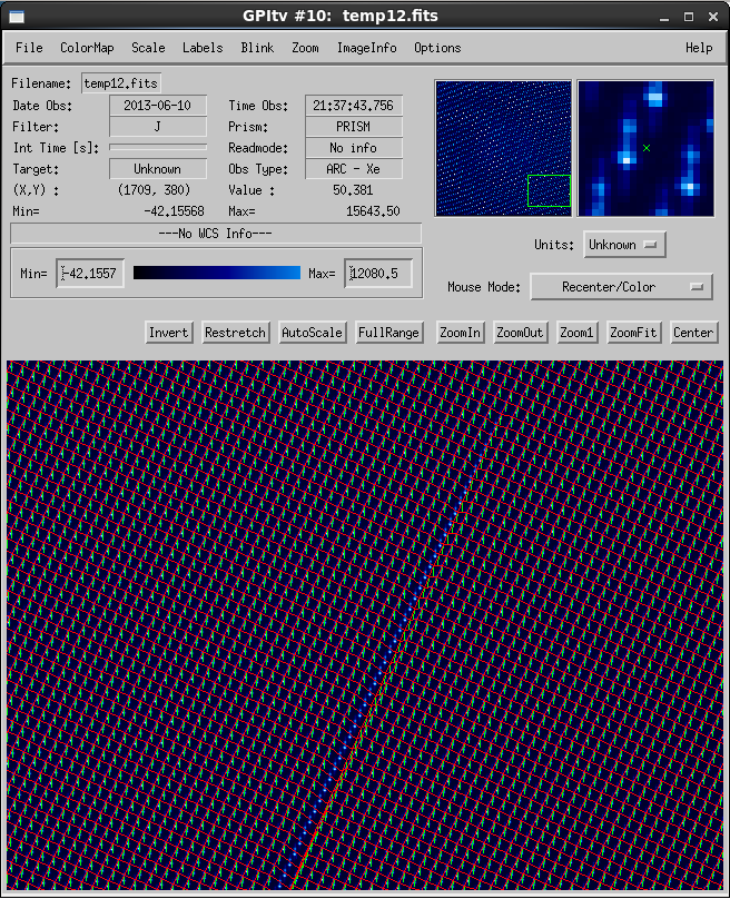 Performing the wavelength calibrations are quite simple but ensuring that the determination was successful does require examination of the solution in GPItv (see the Displaying GPI Wavelength Calibration feature documentation). As the Gaussian fitting routines that determine the locations of the of spots are sensitive to bad pixels, it is recommended that a recent badpixel mask is used. The following figure shows the successful completion of a wavelength calibration.
